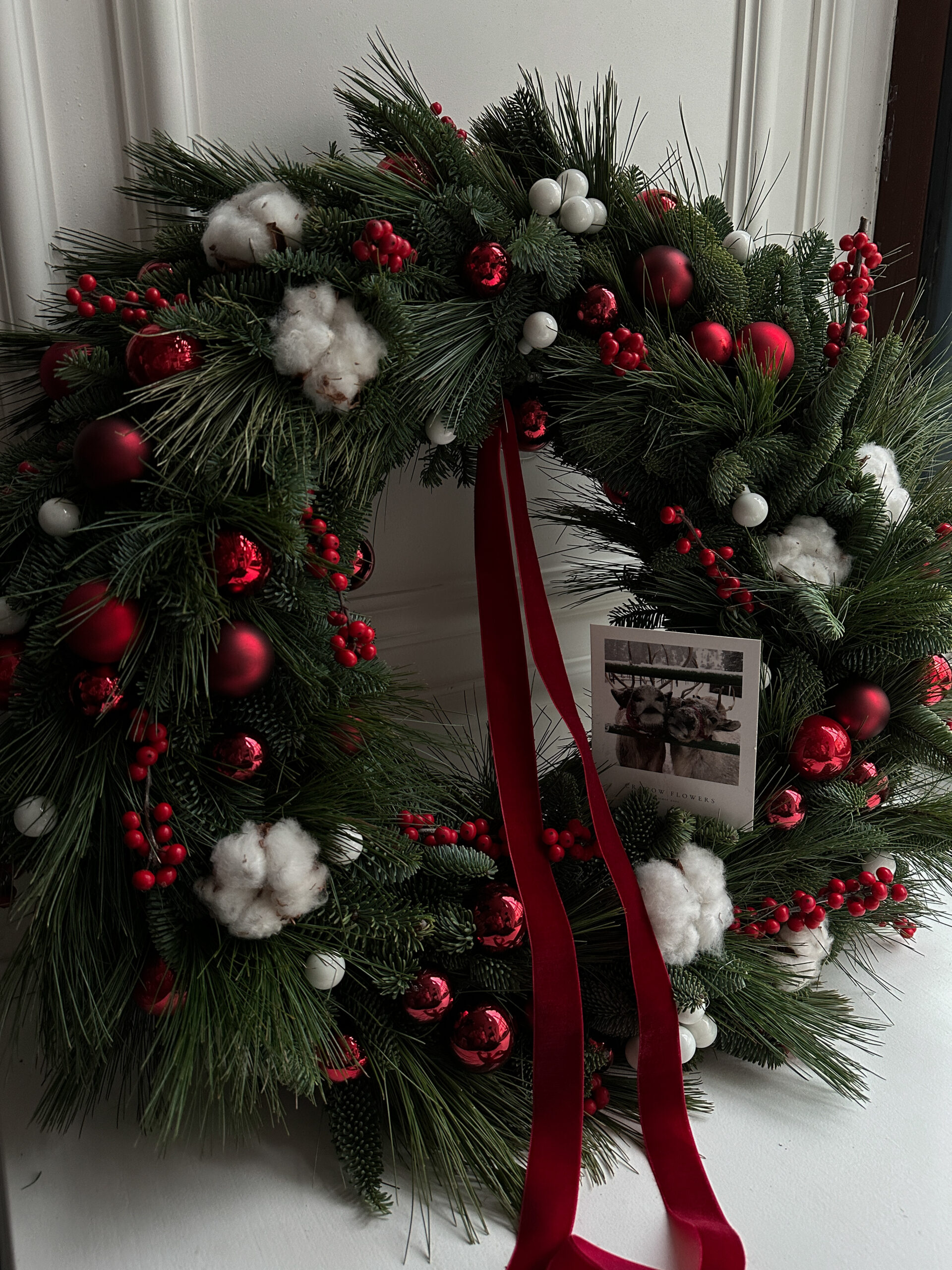 Dekoracja: ilex, bawełna, dekoracyjna wstążka Baza: w całości naturalna, jodła nobilis premium Kolorystyka: czerwień, biel, zieleń